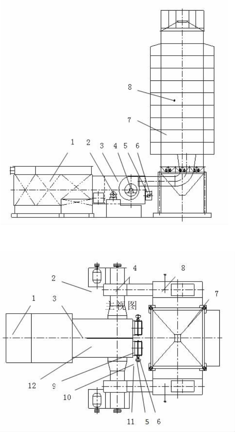 1.熱交換器;2.電機;3.混合室;4.主風機;5.調(diào)風筒;6.風門板;7.種子干燥機;8.溫度傳感器;9.閥門軸;10.聯(lián)軸器;11.電動執(zhí)行器;俯12視.混圖合室中間隔板
